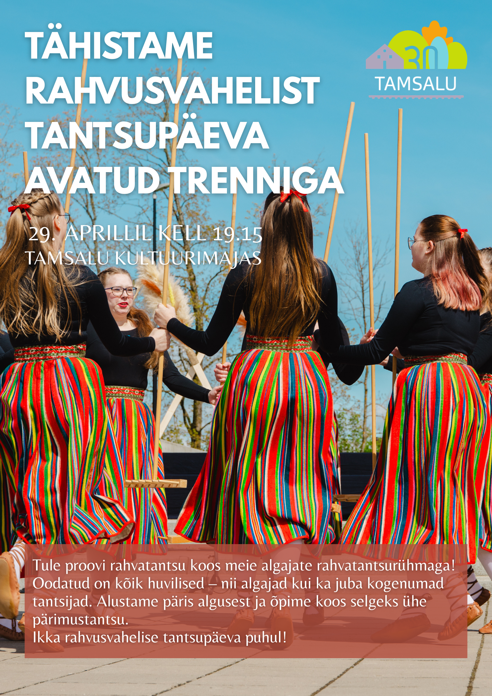 Tähistame rahvusvahelist tantsupäeva avatud treeninguga! Tule proovi rahvatantsu koos meie algajate segarühmaga! Oodatud on kõik huvilised – nii algajad kui ka juba kogenumad tantsijad. Alustame päris algusest ja õpime koos selgeks ühe pärimustantsu. Kui oled kunagi mõelnud rahvatantsu proovimisele, siis nüüd on õige aeg – tule julgelt kohale! Ehk avastad uue toreda harrastuse ja soovid […]