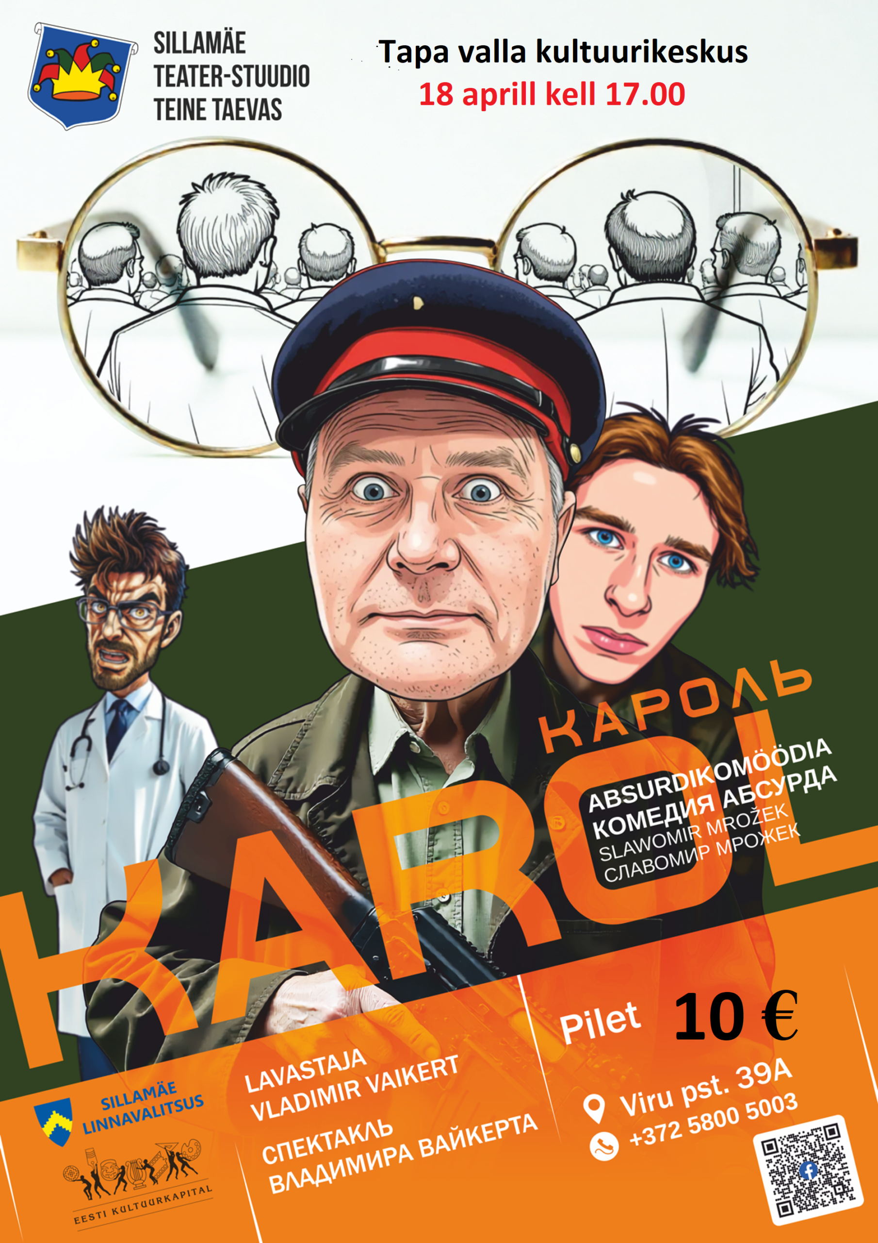 Sillamäe teater-stuudio ” Teine taevas”. Etendus on venekeelne, absurdikomöödia. Lavastaja: Vladimir Vaikert Silmaarsti juurde tuleb kummaline paar – poolpime vanaisa koos lapselapsega. Esmapilgul ei midagi erilist. Vanaisa vajab prille, et tappa Karol, keda ta pole kunagi näinud. Arsti abiga tapetakse aga hoopis kõrvaline inimene. Keegi pole kaitstud. Karoliks võib osutuda igaüks. Pilet 10 eurot. Pileteid […]