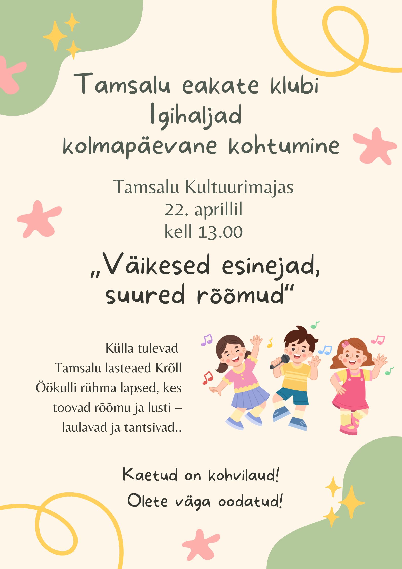 Ootame teid emadepäeva kontserdile „Kaunid hetked emale“, mis toimub 8. mail kell 18.00 Tamsalu Kultuurimajas. See südamlik kontsert on pühendatud kõikidele emadele ja vanaemadele. Lavale astuvad meie oma lapsed ja noored, jagades publikuga kauneid hetki laulu, tantsu ja muusika kaudu. Tule veeda üks soe ja meeldejääv õhtu koos perega ning kingi emale kaunid hetked.