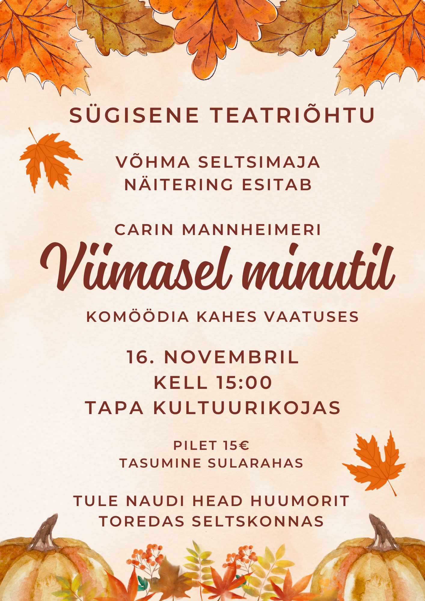 16. novembril kell 15.00 esitab Võhma Seltsimaja näitering Tapa Kultuurikojas Carin Mannheimeri komöödiaetendust „Viimasel minutil“.